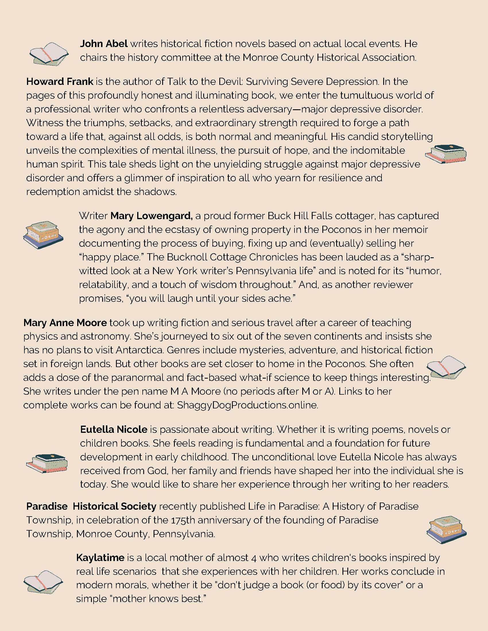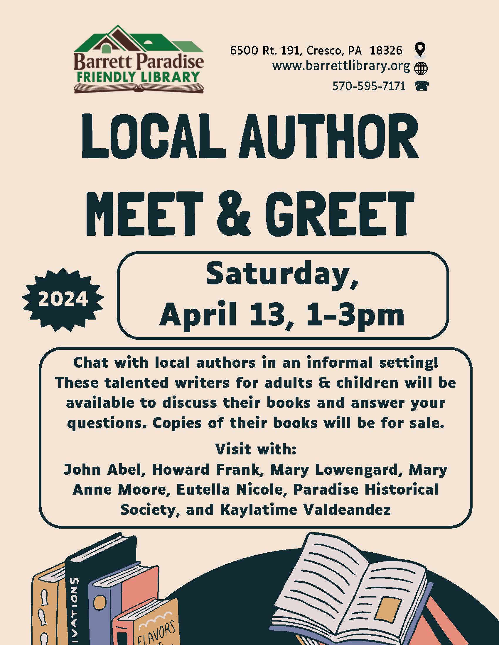 Stop by the Weiler Family Community Room for an opportunity to chat with several local authors in an informal setting! These talented writers will be available to discuss their books and answer your questions.